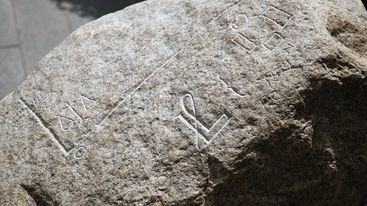 Not all those who wander are... (Instant History #1) was developed for Loyens & Loeff and consists of a natural boulder into which core notions and illustrations related to Loyens & Loeff have been hand-carved, based on employees' notes taken during a workshop together (see top image).
